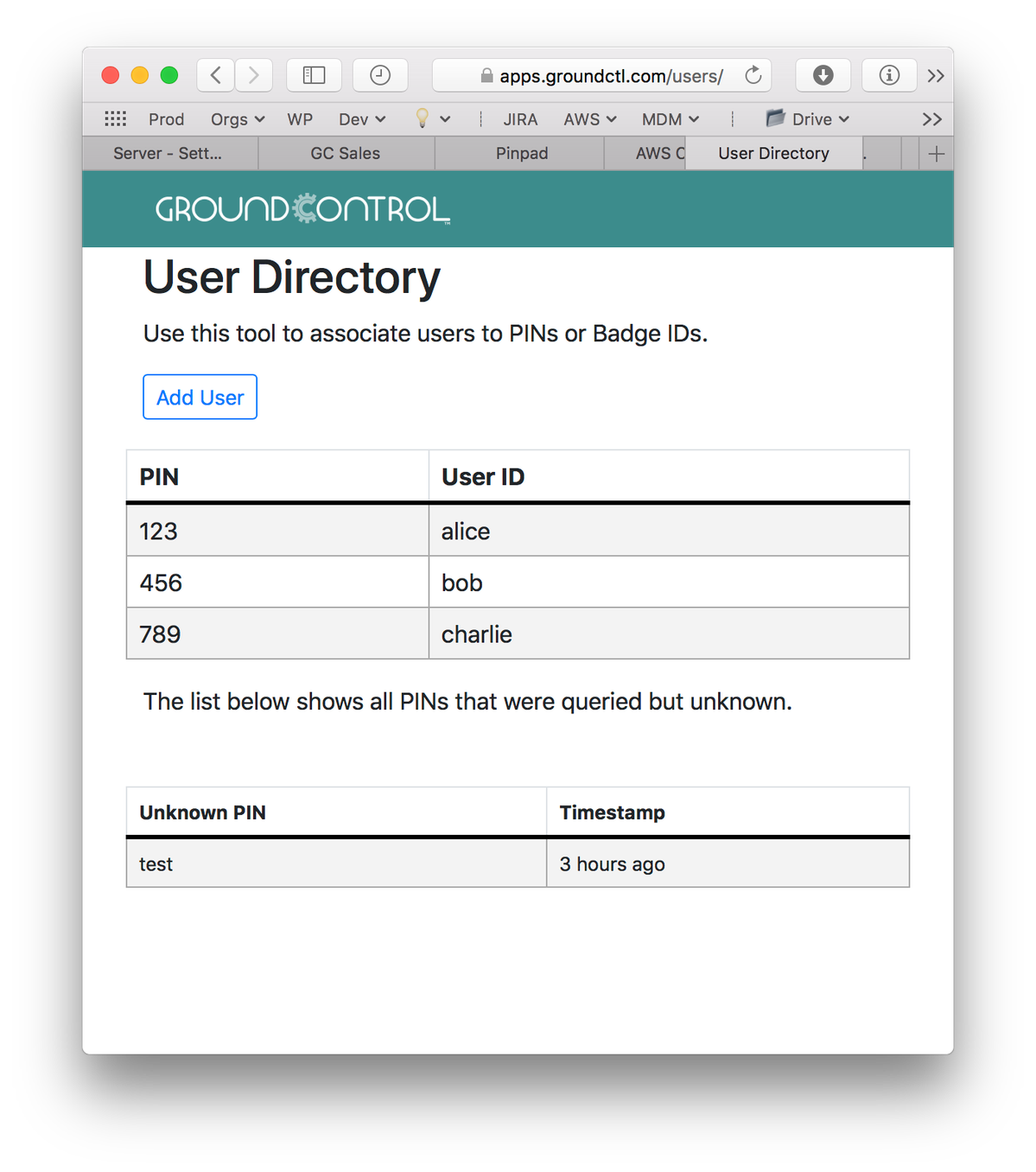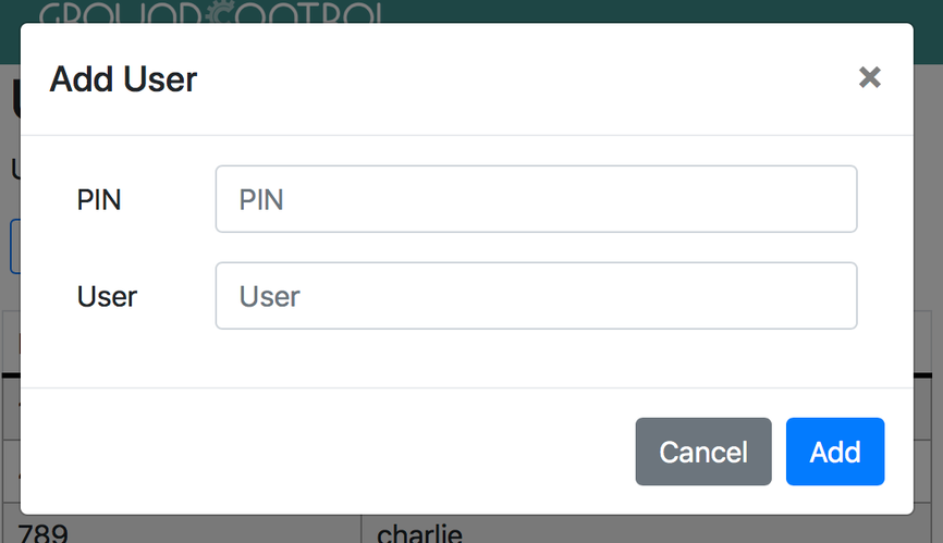 - Click Add User to add the scanned badge ID and a username. This system does not integrate with your organization’s canonical user directory, so you can choose any user name. Also create a simple numeric PIN such as “123”.
